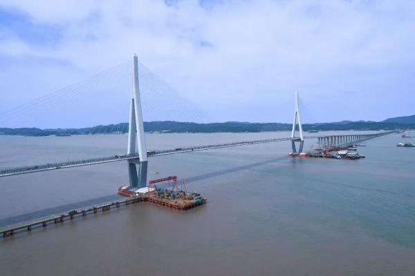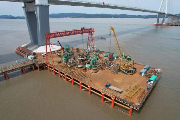 10月1日上午,市域郊鐵路象山港大橋施工現(xiàn)場,主棧橋施工機(jī)械、運(yùn)輸車輛絡(luò)繹不絕,鉆機(jī)和泵車等設(shè)備轟聲隆隆,一片繁榮景象。海上棧橋已連通至69號墩,該項(xiàng)目正在緊鑼密鼓地?fù)屪ブ鞫浙@孔灌注樁施工,海上鉆孔平臺上近百名工人日夜兼程,24小時(shí)連續(xù)施工。